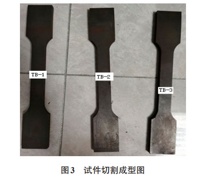 拉伸試件從本材上取樣,尺寸參考GB/T 228.1-2010《金屬材料拉伸試驗(yàn)第1部分:室溫試驗(yàn)方法》[8]確定,見圖1。試件長(zhǎng)度300mm。共設(shè)計(jì)三個(gè)相同的復(fù)合比,編號(hào)分別為TB-1、TB-2、TB-3。鋼材基層厚度10mm,鈦層厚度2mm。試件尺寸設(shè)計(jì)見圖2。切割成型后的試件見圖3。