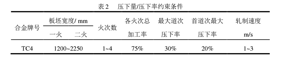 根據(jù)軋機機組配置情況可對軋制力、軋制力矩、電機功率、軋制速度上限等條件進行判斷。軋制初始溫度、終軋溫度、壓下率等工藝參數(shù)的確定與材料特性密切相關(guān)。表2為TC4 鈦合金的壓下量/壓下率的約束條件。表3給出 TC4鈦合金的軋制溫度范圍及推薦的溫度制度。